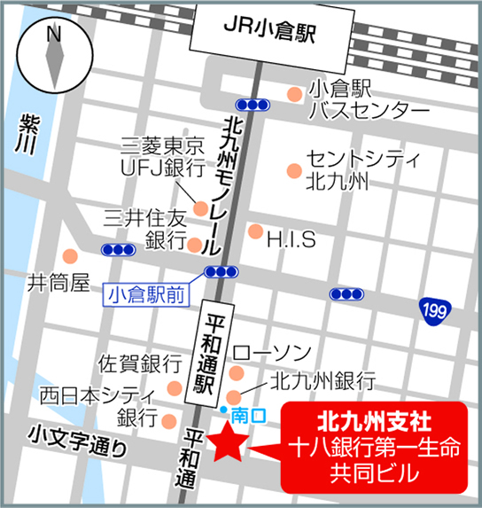 モノレール平和通駅の出入り口9から出て下さい。平和通りを小倉駅とは反対側(南側 道なり)へ進んでいただき平和通の交差点の角にあるビルが十八銀行第一生命共同ビルになります。