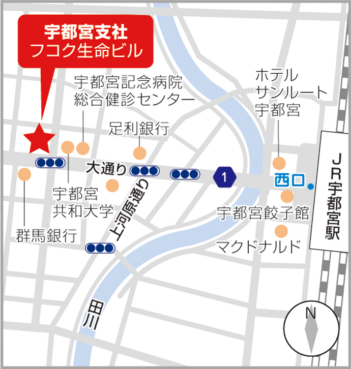 JR宇都宮駅西口から出て下さい。大通りを西向きに進んでいただき、宇都宮記念病院をすぎると見えてくるのがフコク生命ビルになります。