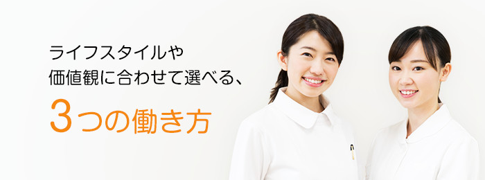 かんご畑では、福祉分野専門の人材サービスならではの豊富な求人情報をもとに、求職者様のニーズに合わせて3つの働き方をお選びいただけます。