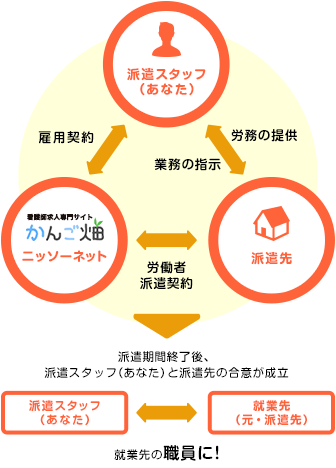 まずは派遣スタッフとして一定期間勤務し、派遣期間終了時に派遣先と本人の合意のもと、直接雇用の職員への登用が行われる制度です。